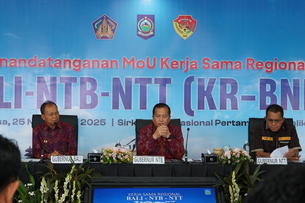 NTB – Balivrita.com, Gubernur Bali, Wayan Koster bersama dengan Gubernur NTB, Lalu Muhamad Iqbal dan Gubernur NTT Emanuel Melkiades Laka Lena menandatangani Memorandum of Understanding (MoU) kerjasama tiga Provinsi di Sirkuit Internasional Pertamina Mandalika, Selasa (25/11/2025). Penandatanganan MoU tersebut merupakan tindak lanjut dari Kerjasama regional Bali Nusa Tenggara (KR-BNN) yang sebelumnya di gelar di Bali pada 3 November 2025 lalu.
